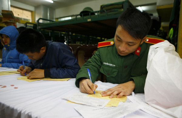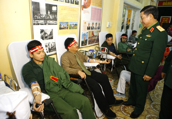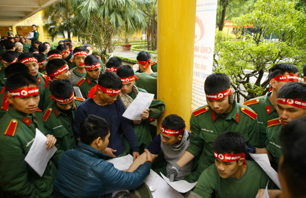 Bác sĩ bệnh viện 108 đang tiếp nhận máu và ghi tên nhóm máu tại đơn vị