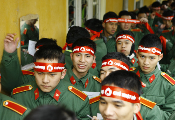 Hàng trăm học viên xếp hàng đợi đến lượt ghi tên hiến máu