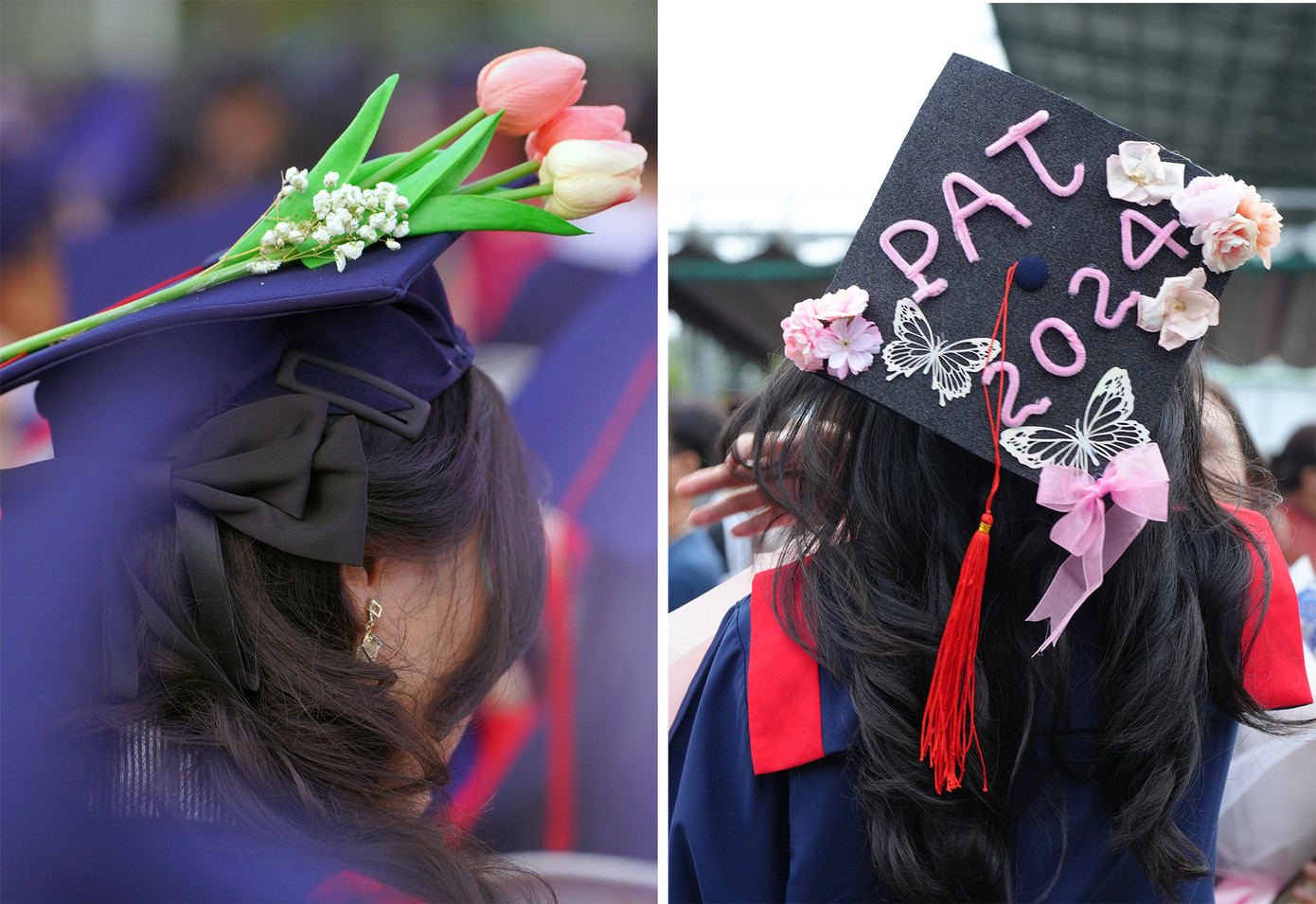 Đặc biệt, một trong những điểm nhấn của chương trình còn đến từ những chiếc mũ “có một không hai” của các sinh viên. Những chiếc mũ sặc sỡ, được trang trí cầu kỳ với hoa giả, ruy băng… xuất hiện khắp sân vận động, thể hiện sự sáng tạo của bạn trẻ trong ngày lễ tốt nghiệp này.