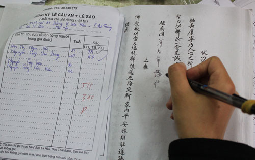 Hồi năm thứ nhất, Lộc đã đăng ký đi viết sớ đầu năm. Khi đó, có người trong khoa nhận sớ về rồi phân cho từng lớp. Chữ viết còn chậm, phải tra từ điển nhiều nên cậu chỉ dám nhận hơn 100 lá sớ. Giờ thì chỉ cần vài phút là Lộc viết xong một lá. "Bài khấn cầu an, giải sao trên lá sớ đều đã in sẵn, bọn em chỉ việc viết tên, tuổi, địa chỉ của tín chủ vào thôi. Chữ nào thuần Việt, chưa rõ thì lại tra từ điển hoặc hỏi bạn ngồi bên", Lộc cho hay.