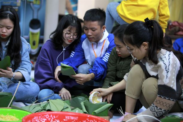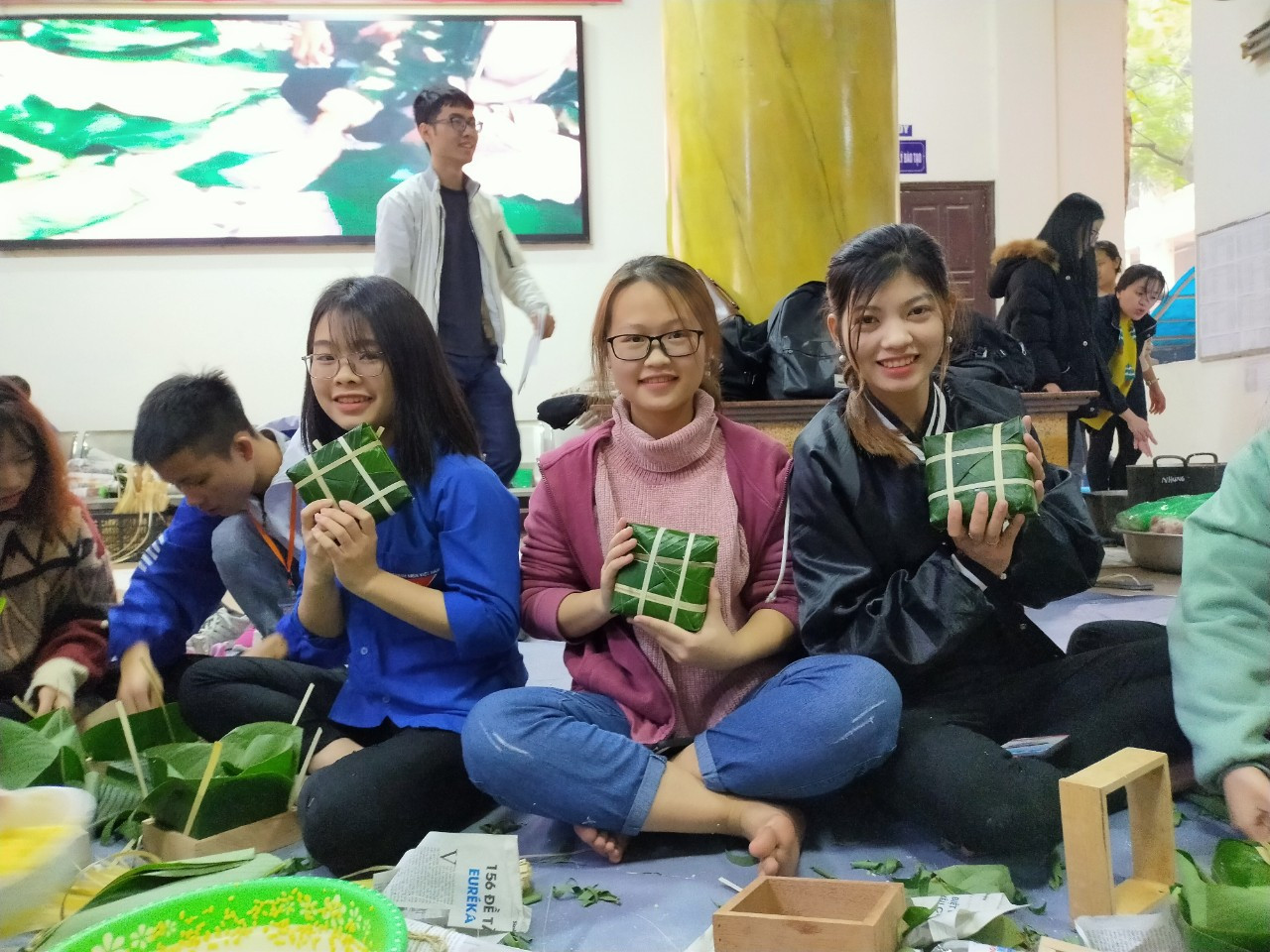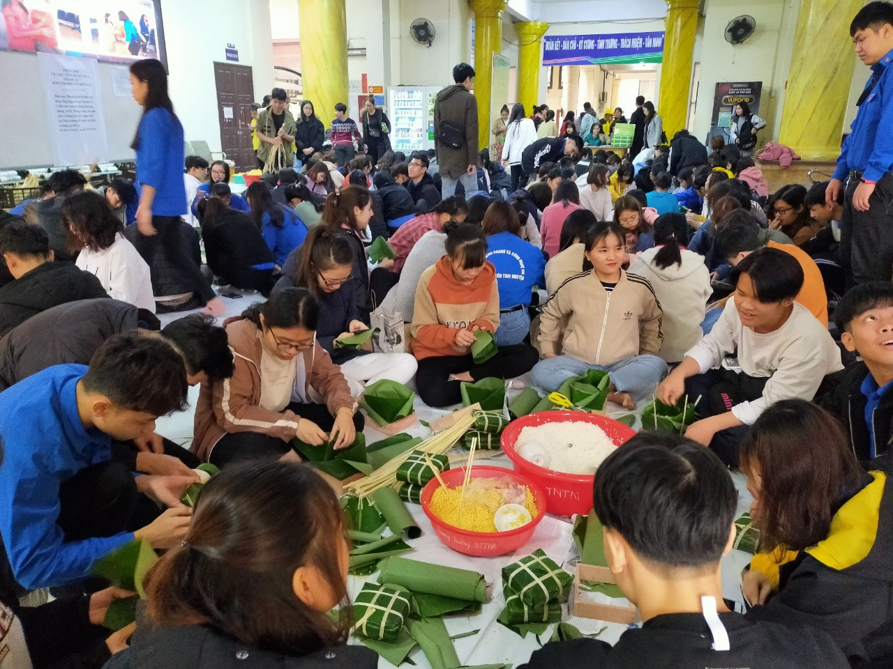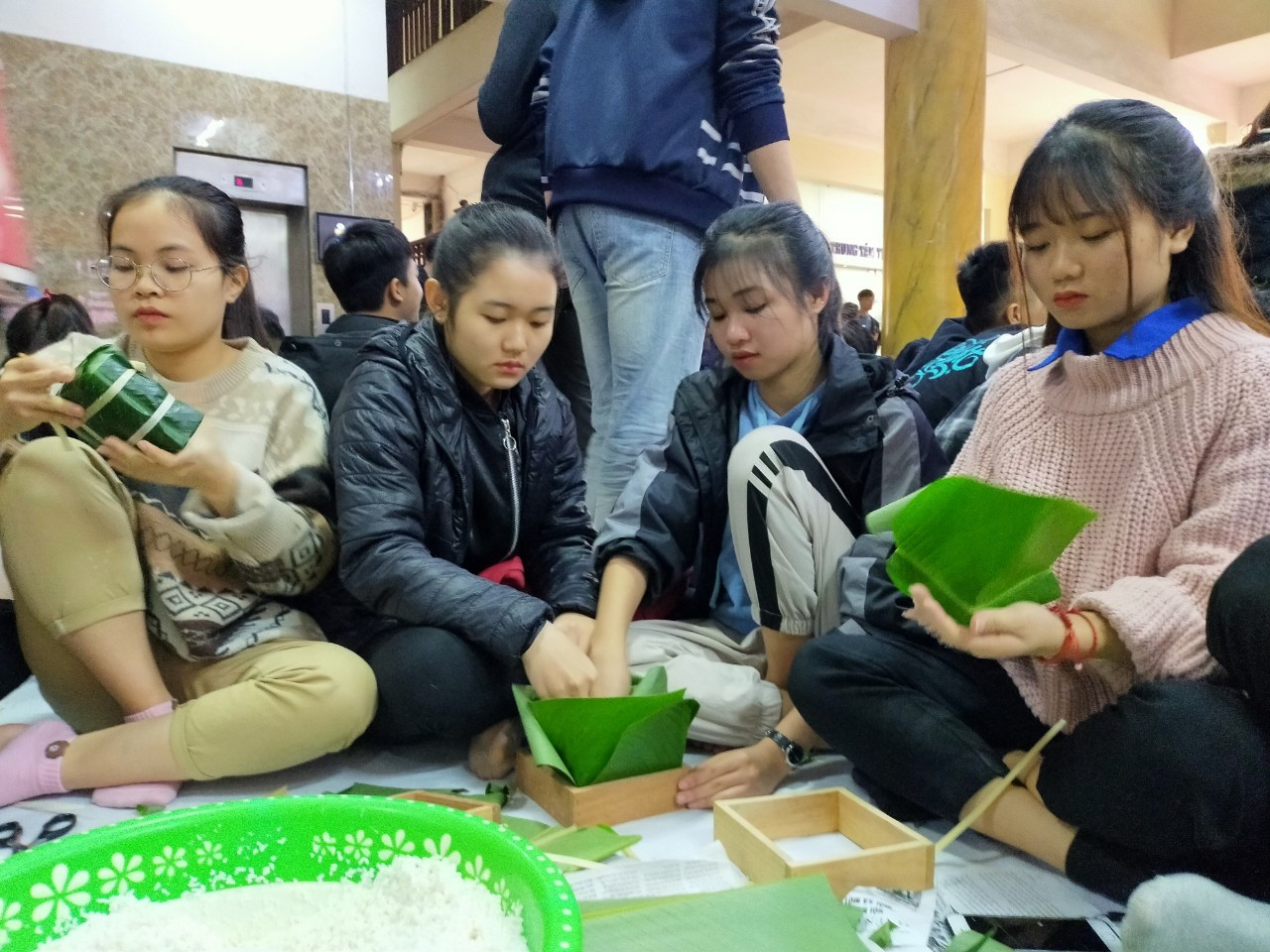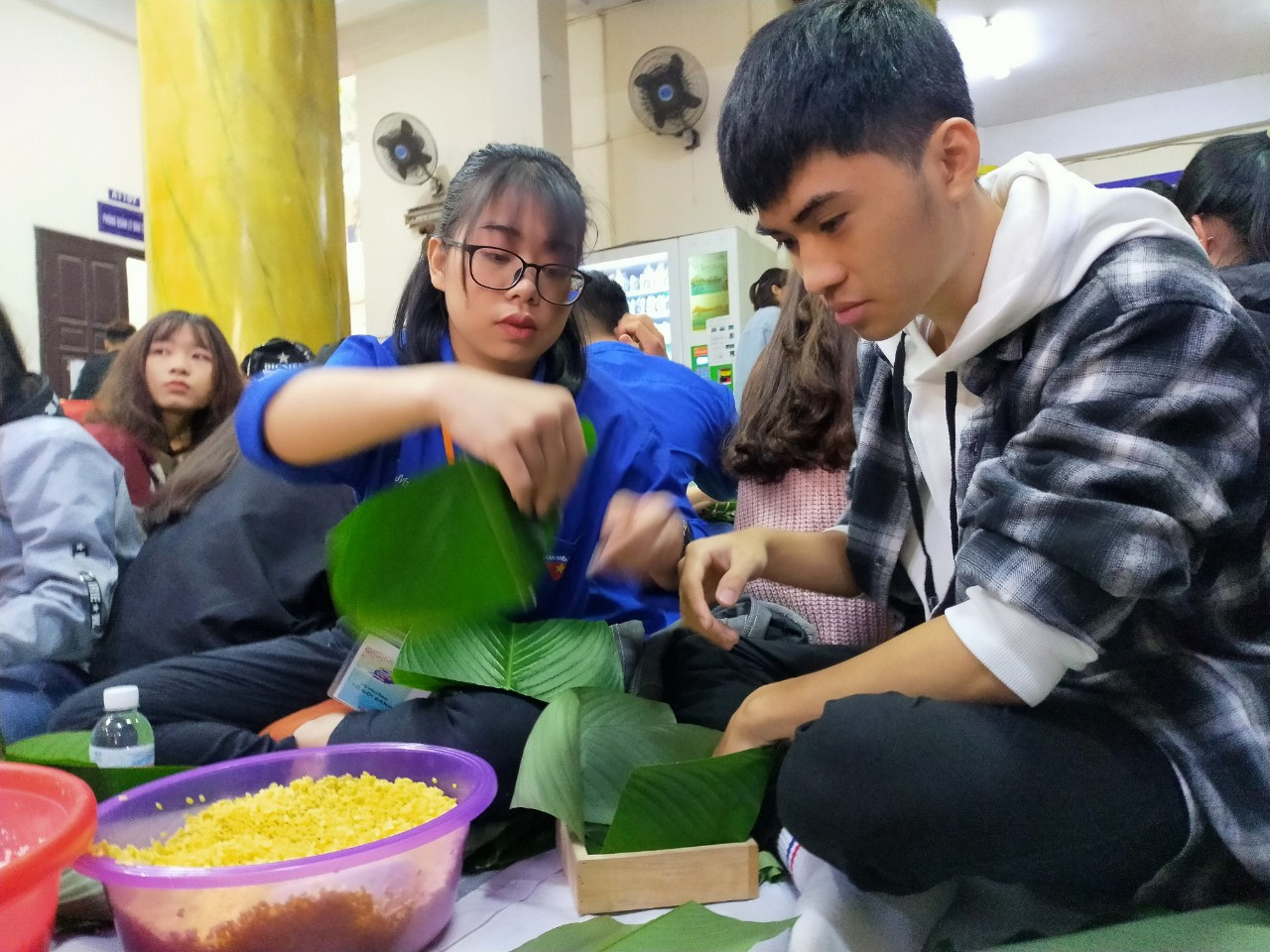Không những thế, ngày hội “Xuân đùm bọc, Tết đoàn viên” các bạn sinh viên còn được tham gia trổ tài gói bánh chưng, một loại bánh truyền thống không thể thiếu trong ngày Tết cổ truyền của dân tộc. Bạn Phạm Thị Thu Nga (lớp TR23.14, khoa tiếng Trung) chia sẻ: “là một người không biết gói bánh, nhưng sau hôm nay em có thể tự tin hỗ trợ bố gói bánh Tết. Thông qua chương trình em cũng muốn gửi gắm một chút tình cảm đến những người có hoàn cảnh khó khăn, hi vọng với số bánh này, ngày Tết với họ càng thêm ý nghĩa”.