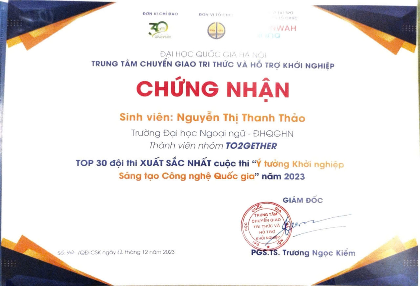 -TOP 30 toàn quốc cuộc thi Ý tưởng Khởi nghiệp Sáng tạo Công nghệ Quốc gia 2023 (ROAD TO STARTUP 2023) với đề tài “TO2GETHER - Đồ chơi giáo dục hòa nhập cho trẻ tự kỷ (dưới 6 tuổi)” (Ngày 12.12.2023) do Trung tâm chuyển giao tri thức và hỗ trợ khởi nghiệp, cấp Đại học Quốc gia Hà Nội tổ chức.