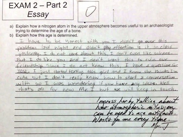 Sinh viên giấu tên không hề biết câu trả lời cho bài kiểm tra sinh học, thế nên anh ta quyết định viết một đoạn trần tình cùng giáo viên với nội dung “Em phải thành thật với thầy là tối qua em đã không học bài này và ngày hôm qua trên lớp thì em không chú ý đến bài giảng. Em thật sự không quan tâm đến điều này, thậm chí em chả thích khoa học.