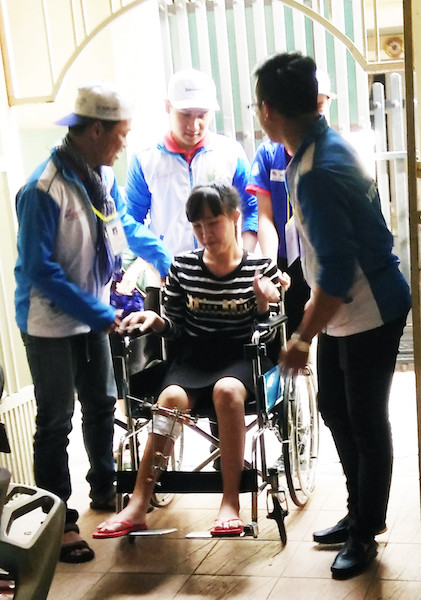 Do phòng thi ở tận tầng 3 nên sinh viên tình nguyện phải khiêng cả cô gái và xe lăn qua những bậc cầu thang nhỏ hẹp. Tình nguyện viên Bùi Thị Hồng Gấm (sinh viên năm nhất Đại học Đà lạt) nói các bạn nam khiêng rất vất vả, còn em mang giúp cặp sách của thí sinh.
