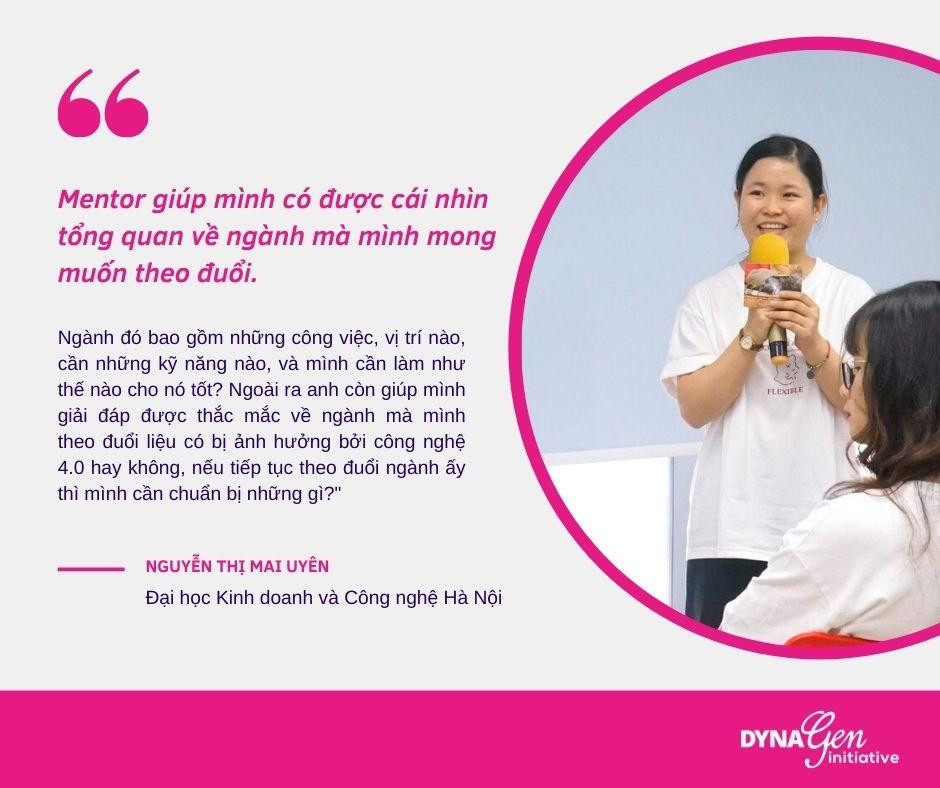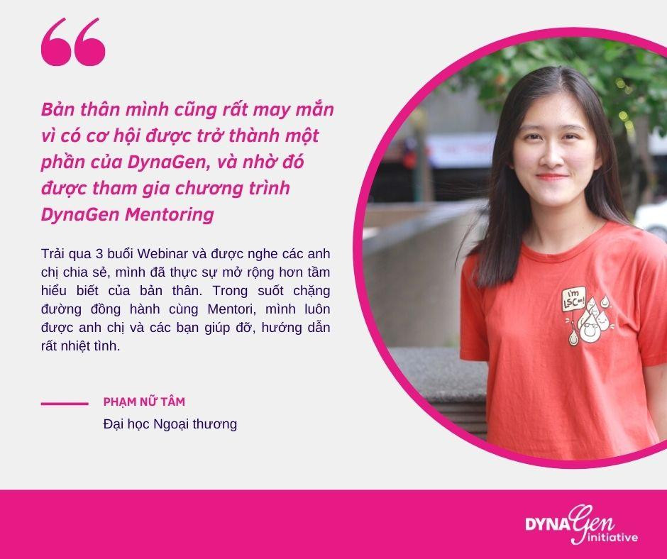 Mỗi sinh viên DynaGen đã có tối đa 3 phiên cố vấn 1:1 và 3 buổi hội thảo trực tuyến cùng các Mentor dày dặn kinh nghiệm: Hội thảo trực tuyến “Tìm kiếm công việc bạn yêu thích” với sự tham gia của anh Nguyễn Quý Tiến - Founder Mentori Vietnam, Hội thảo “Làm sao để có một buổi Mentoring hiệu quả” với sự tham gia của chị Trần Thị Thùy Linh - Marketing Manager tại Mentori Vietnam và Hội thảo trực tuyến cuối cùng mang tên “Tư duy phát triển - Bắt đầu cho sự thành công” với sự tham gia của diễn giả Lê Quang Anh - Giám đốc Quản trị Chiến lược tại Ngân hàng TMCP Hàng Hải Việt Nam. Đây là cơ hội hiếm có để sinh viên được Mentor chia sẻ kiến thức, kinh nghiệm và giải đáp những thắc mắc liên quan đến nghề nghiệp mà các bạn đang hướng tới.