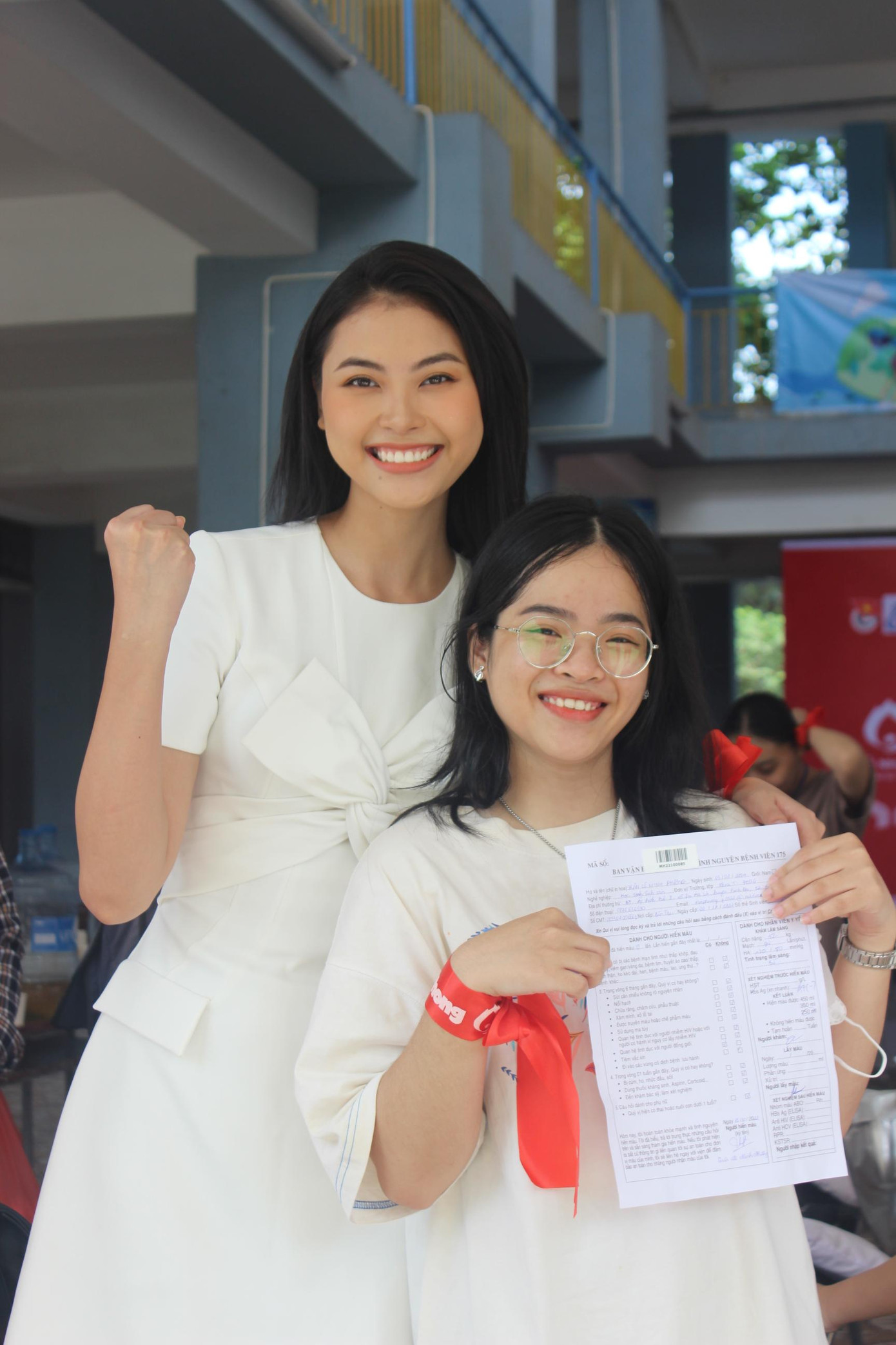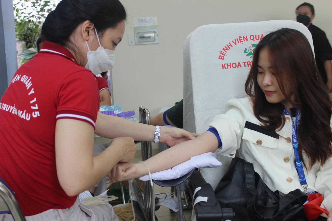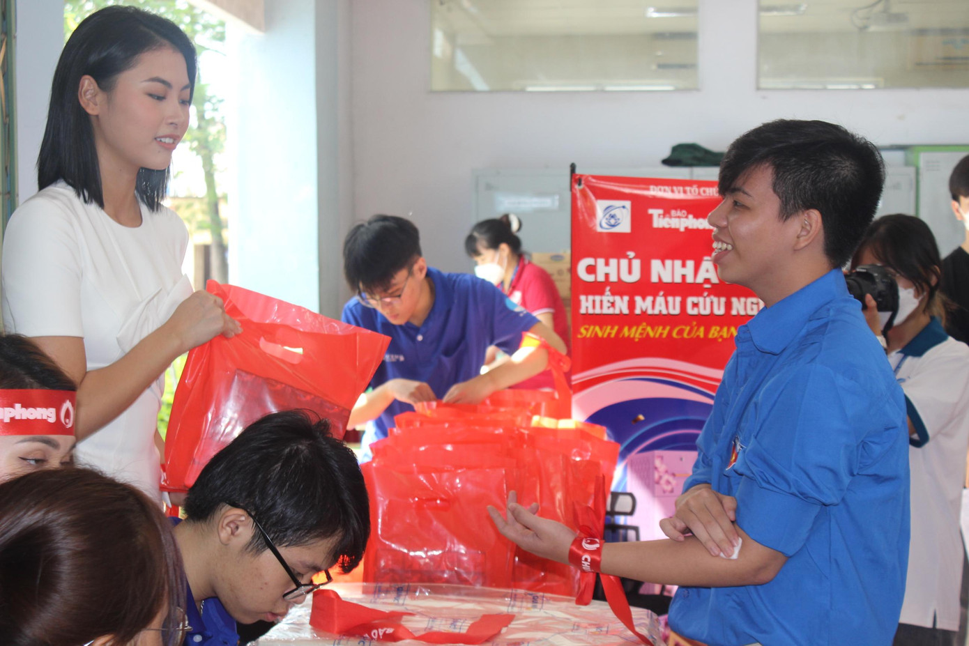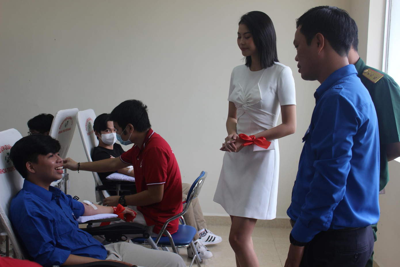 | Hoa khôi Huỳnh Thúy Vi bắt tay động viên một bạn sinh viên đang hiến máu. |