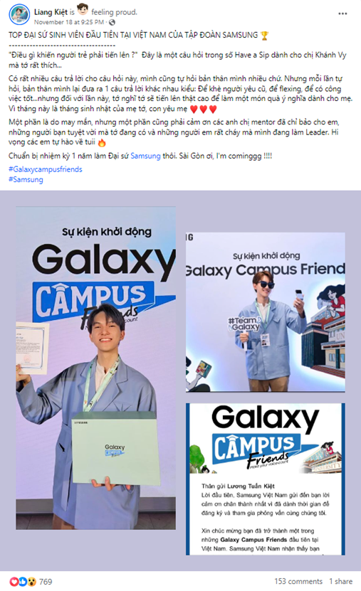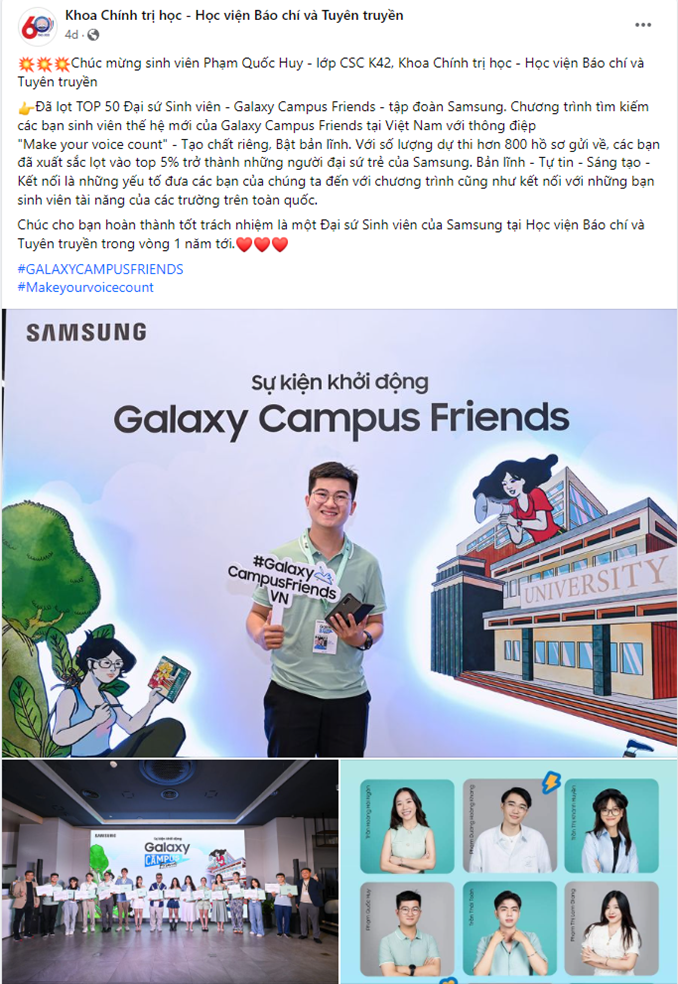 Đồng thời, sự tự hào với thành tích đạt được danh hiệu Galaxy Campus Friends không chỉ ở các bạn sinh viên, mà còn lan tỏa đến các khoa tại trường đại học trên toàn quốc đang thi nhau “tôn vinh” những tài năng trẻ.