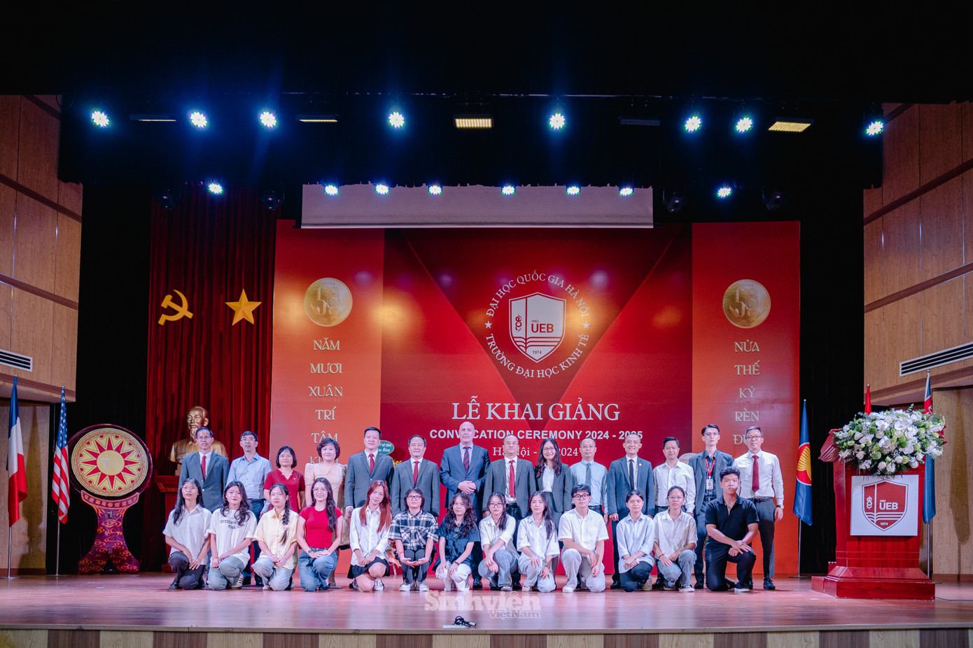 | PGS.TS Nguyễn Trúc Lê - Bí thư Đảng ủy, Chủ tịch Hội đồng Trường; PGS.TS Lê Trung Thành - Hiệu trưởng UEB; PGS.TS Nguyễn Anh Thu - Phó Bí thư Đảng ủy, Phó Hiệu trưởng; TS Phạm Minh Tuấn - Phó Hiệu trưởng và TS Hoàng Khắc Lịch – Phó Hiệu trưởng UEB trong nghi thức rước cờ truyền thống, chào đón hơn 2300 tân sinh viên nhập học. |
