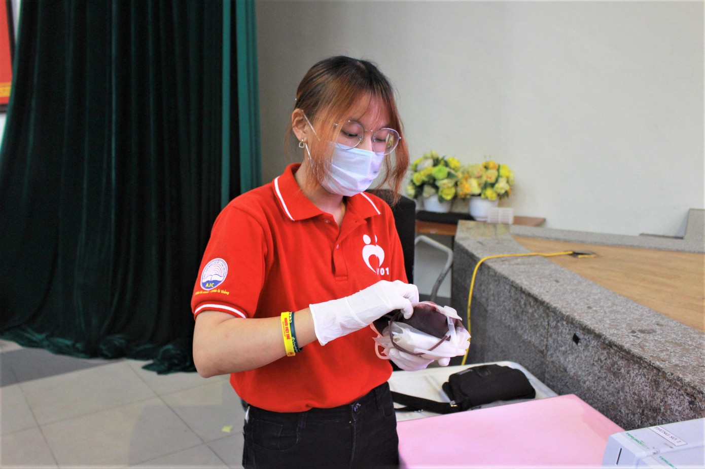 | Phạm Thu Trang - sinh viên Học viện Báo chí và Tuyên truyền rất hăng say với vai trò là tình nguyện viên đội máu trong mùa dịch. |