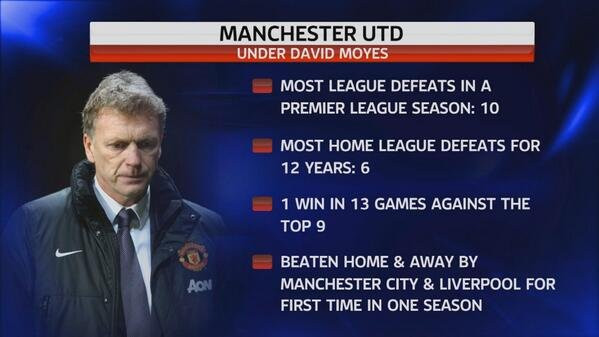 Hồi tháng Hai, Sky Sports đã tổng hợp danh sách những kết quả tệ hại của Man United ngay mùa giải đấu tiên dưới thời Moyes. Trong đó có thông tin đáng chú ý như Man United hiếm khi thua trên sân nhà trước West Brom, Newcastle, Swansea và Everton, nhưng Moyes đã làm được.
