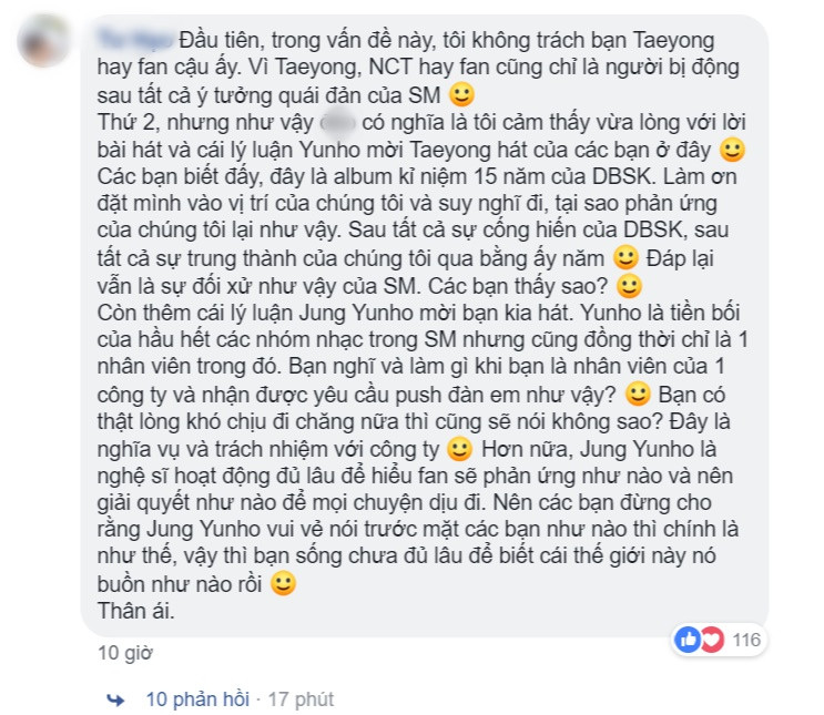 Có thể thấy, các fan DBSK bức xúc đến vậy là do họ đã chứng kiến thần tượng bị SM đối xử bất công trong nhiều năm. Và album New Chapter #2: The Truth of Love lần này như giọt nước làm tràn ly. Mặc dù vậy, một số fan khẳng định họ không trách Tae Yong (NCT) mà chỉ "ném đá" SM mà thôi!