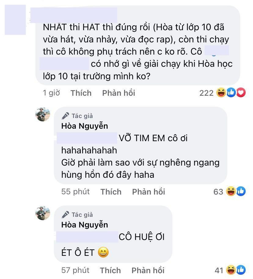 Cô giáo cũ khiến Hòa Minzy hồi hộp khi vào bình luận nhưng tiếc rằng cô chỉ xác nhận giải Nhất trong cuộc thi hát còn thi chạy cô không phụ trách nên không nhớ.