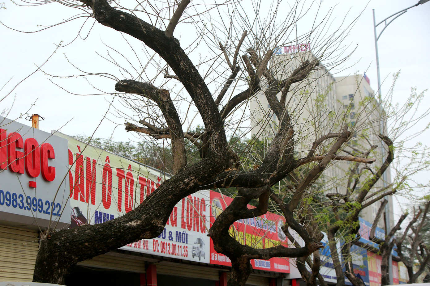 Hàng cây sưa đỏ trồng trên vỉa hè đã có dấu hiệu khô héo, mục nát, trơ trụi lá và không còn khả năng sinh trưởng - Ảnh: Trọng Tài