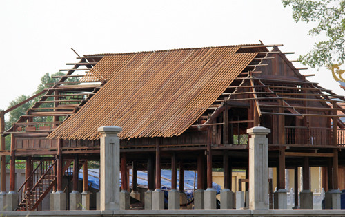 Bao quanh nhà thờ tổ nghiệp của Hoài Linh là con rạch cùng những bức tường cao 4 m. Công trình có hai nhà lớn và một căn nhỏ. Trong đó, căn áng ngữ mặt tiền đã gần hoàn thiện, còn nhà gỗ phía sau còn dở dang.