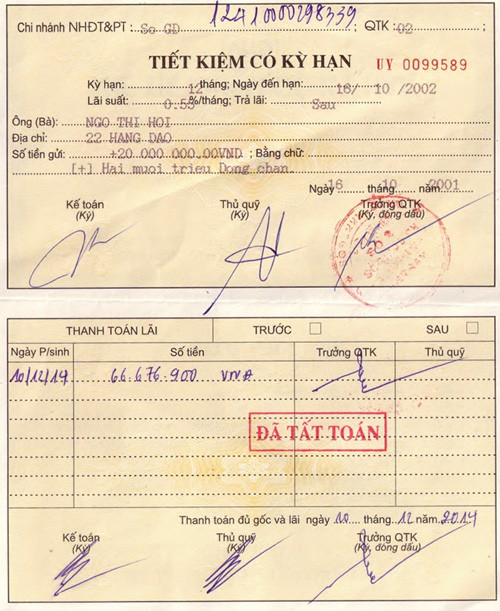 Theo ngân hàng, ngày 13/5/1999, bà Ngô Thị Hợi đã gửi 27 triệu đồng kỳ hạn 6 tháng, lãi suất 0,80% một tháng. Đến 16/10/2001, bà gửi tiếp 20 triệu đồng kỳ hạn 12 tháng, lãi suất 0,55% và 7.000 USD kỳ hạn 12 tháng, lãi suất 2,25% một năm.