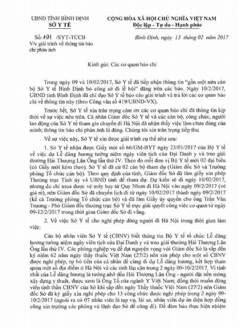 Theo đó, ông Lê Quang Hùng, Giám đốc sở Y tế Bình Định giải thích cụ thể sự việc như sau: Sở Y tế nhận được giấy mời số 66 ngày 23/1/2017 của Bộ Y tế về việc dự lễ dâng hương tưởng niệm ngày viên tịch Đại danh y và trao giải thưởng Hải Thượng Lãn Ông lần thứ IV.