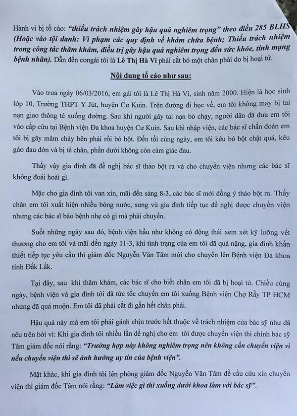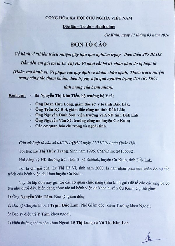 Chiều cùng ngày, chị Lê Thị Thùy Trang (SN 1996), sinh viên năm thứ 2 trường Cao đẳng Sư phạm Đắk Lắk, đại diện gia đình cháu Hà Vi đến báo Tiền Phong gửi đơn tố cáo 5 cán bộ y tế liên quan đến hậu quả mất chân của em gái mình. Đơn đồng gửi Bộ trưởng Bộ Y tế cùng nhiều sở ngành liên quan.