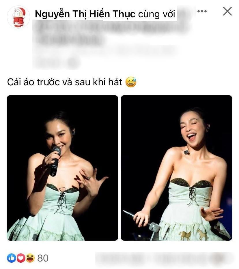 Ấy vậy mà trên trang cá nhân, Hiền Thục lại rất thích thú với bộ váy siêu hở này, thậm chí còn đăng ảnh so sánh trang phục trước và sau khi cô biểu diễn để thấy nó hở nhiều đến đâu. Không chỉ trên sân khấu mà ngoài đời thực, Hiền Thục cũng nhiều lần diện những chiếc áo bé xíu khoe bờ ngực gợi cảm hoặc cả tấm lưng thon.