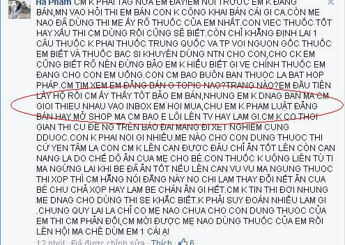 Điều đáng nói là mặc dù cách tư vấn và cung cấp thuốc lạ lùng và nhiều nghi vấn như vậy, vẫn rất nhiều mẹ tin tưởng và mua thuốc và cho con mình uống. Với những thành viên chất vấn về nguồn gốc, chất lượng, thành phần của thuốc và cho rằng đây là bán thuốc hợp pháp, nickname Hapham này phản hồi rằng mình không bán thuốc, không đăng tải thông tin bán thuốc trên diễn đàn nào mà chỉ mua hộ cho những người gửi tin inbox, và ai tin tưởng thì mua thuốc, còn không tin thì thôi.