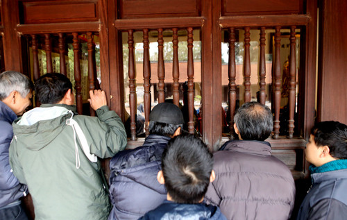 Nhiều người xôn xao đứng ngoài cửa ngó vào trong phòng thi xem các ông đồ dự thi.
