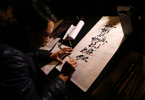 Thí sinh Hà Huy Long đang dự thi thư pháp Tiếng Việt.