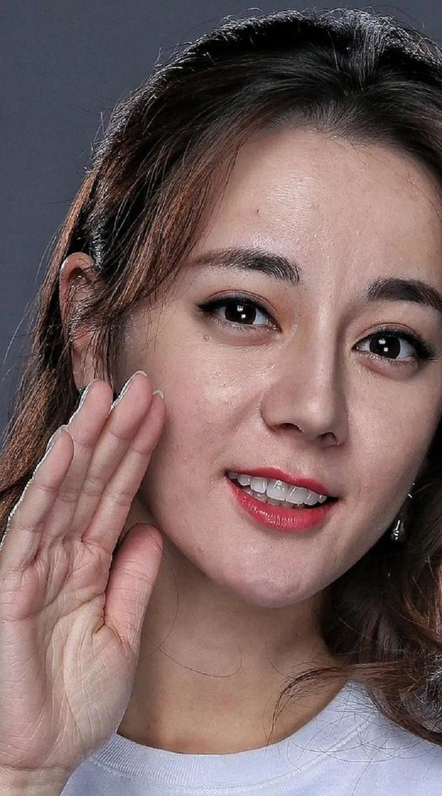 Một bức hình chụp cận khác cho thấy Địch Lệ Nhiệt Ba không có làn da trắng bóc mịn màng mà ngược lại, da cô lấm tấm các đốm mụn nhỏ dù đã được trang điểm kỹ lưỡng.