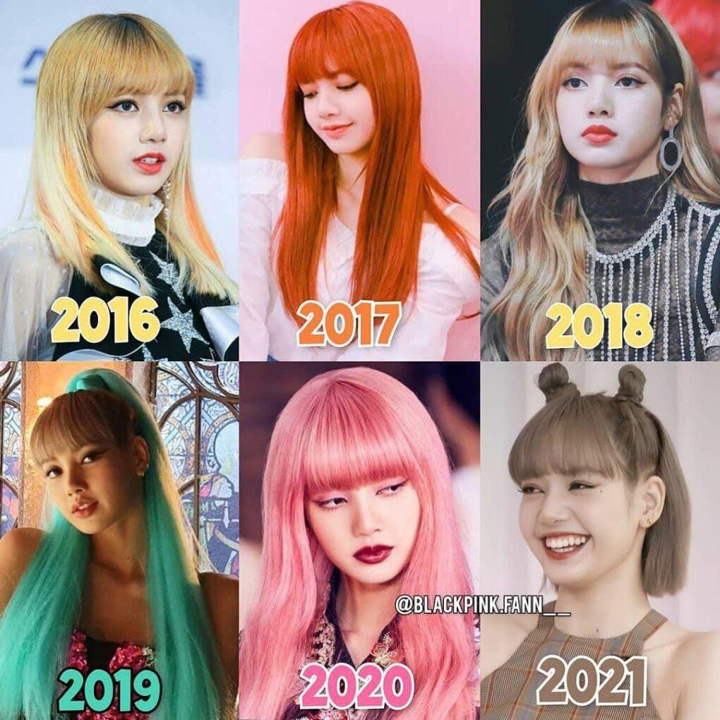 Em út Lisa hóa ra cũng đổi màu tóc liên tục nhưng không hề chia tay tóc mái bất biến. Từ cô búp bê tóc vàng đáng yêu của 5 năm trước, Lisa nay đã thành nữ thần sắc sảo, cá tính với tỷ lệ cơ thể cực chuẩn, nụ cười rạng rỡ đặc trưng.