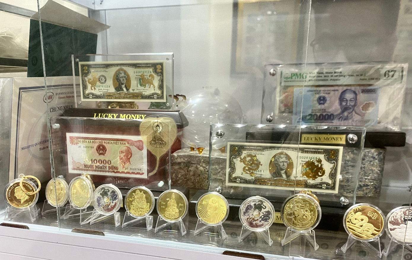 Tiền 2 USD rắn mạ vàng có giá 140.000 đồng/tờ, được tặng kèm một tờ 1 triệu USD thần tài; cặp tiền xu Úc rắn mạ vàng, bạc kèm túi gấm đỏ có giá 80.000 đồng/cặp; tiền xu Phật Tổ Như Lai có giá 60.000 đồng/xu; tiền xu Hồng Kông - Trung Quốc thần tài mạ vàng giá 60.000 đồng/xu…