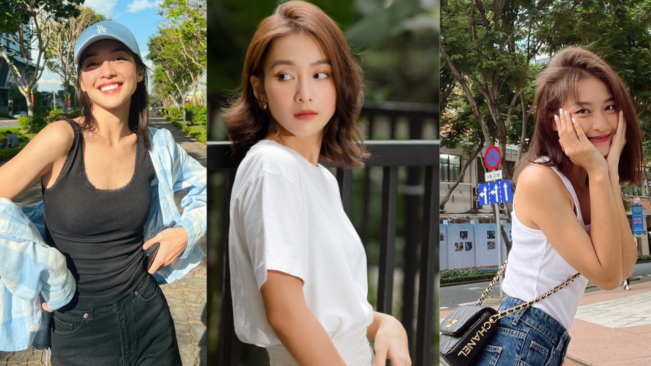 Bên cạnh đó, Khả Ngân vẫn là fan "trung thành" của những kiểu dáng quần áo basic, năng động. Áo thun ba lỗ, quần short, quần bò ống suông... cũng là người bạn thân thiết của nữ diễn viên trong những dịp xuống phố. Đặc biệt, Khả Ngân luôn chọn những màu sắc tối giản là trắng, đen từ phụ kiện cho đến trang phục.