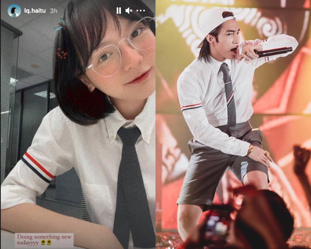 Chiếc áo sơ mi ồn ào nhất những ngày qua chắc hẳn phải là thiết kế của Thom Browne mà Hải Tú mặc và đăng lên Instagram. Netizen nhanh chóng phát hiện Hải Tú đã có set đồ hệt như Sơn Tùng từng mang trình diễn trên sân khấu, từ đó mà ồn ào “đồ đôi” bắt đầu bùng nổ.