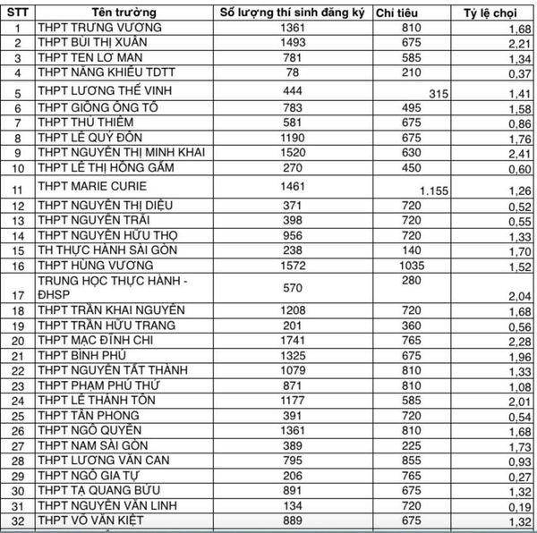 Tỉ lệ chọi này dựa trên số liệu ban đầu về việc học sinh đăng ký nguyện vọng 1 vào lớp 10 so với chỉ tiêu của trường do Sở GD&ĐT TPHCM công bố chiều 12/5.