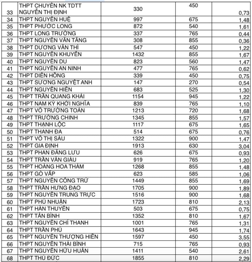 Dựa vào số liệu này, có thể thấy rõ các trường THPT tốp 1, 2 có tỉ lệ chọi khá cao. Dẫn đầu là Trường THPT Chuyên chuyên Lê Hồng Phong có tỉ lệ chọi cao nhất với mức 1/5,42. Kế đến là Trường THPT Nguyễn Thượng Hiền với mức 1/3,55; THPT Gia Định với mức 3,04; THPT Nguyễn Hữu Huân với mức 2,61; THPT Nguyễn Thị Minh Khai với mức 2,41…