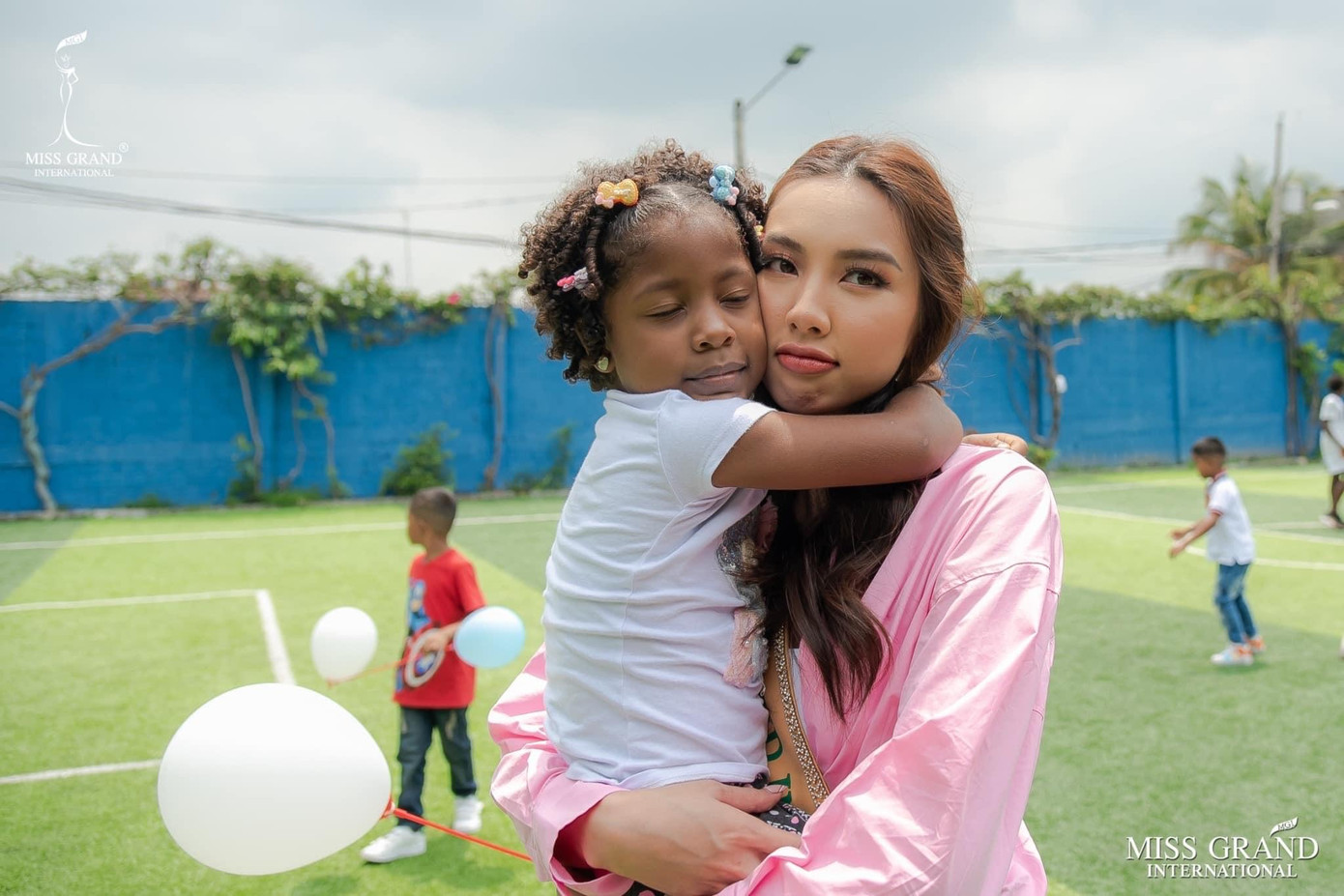 Khác xa với hình ảnh “chặt chém” tại các sự kiện. Hoa hậu sinh năm 1998 bỗng xuất hiện với trang phục thường ngày, quần jean, áo phông cùng chiếc áo sơ mi màu hồng phấn trẻ trung. Lối make up nhẹ nhàng vô cùng gần gũi đã đồng hành cùng cô trong chuyến đi có mục đích từ thiện.