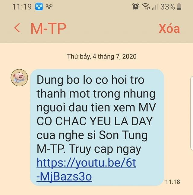 Tin nhắn Sơn Tùng M-TP "thả thính" người hâm mộ qua số điện thoại riêng Với cộng đồng Sky, màn “thả thính” này đã không còn quá xa lạ. Năm 2019, nhiều người hâm mộ cũng nhận được tin nhắn với nội dung “Hãy trao cho anh!!! Sơn Tùng M-TP” từ ID M-TP.