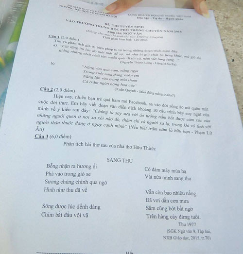 Đề thi gồm 3 câu, học sinh phải thực hiện các yêu cầu: Phân tích giá trị biện pháp tu từ, Phân tích bài thơ “Sang thu” của nhà thơ Hữu Thỉnh. Câu thứ 2 là câu chuyện về giới trẻ mê Facebook, sa vào đời sống ảo mà quên đi cảm xúc cũng như đời sống thực.