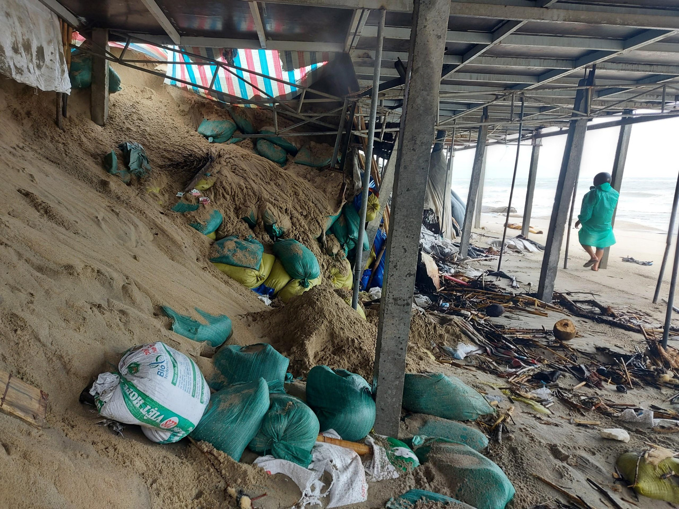 | Theo ông Nguyễn Thế Hùng – Phó Chủ tịch UBND TP. Hội An, bão và hoàn lưu bão khiến 1.000 mét đường bờ biển bị xâm thực. Trước thực trạng này chính quyền đã triển khai làm đê ngầm chắn sóng khá hiệu quả, tuy nhiên những đoạn chưa triển khai tình trạng xâm thực tiếp tục nặng nề. Trong ảnh: Dãy nhà hàng nguy cơ bị sóng "nuốt chửng" |
