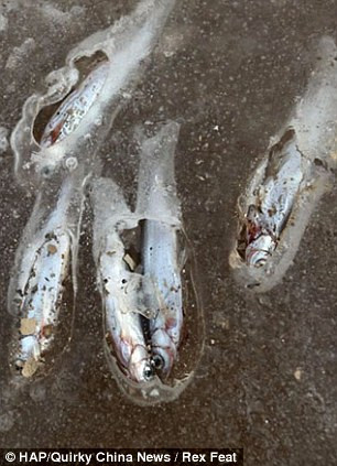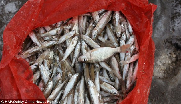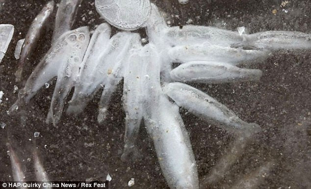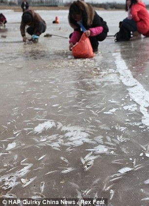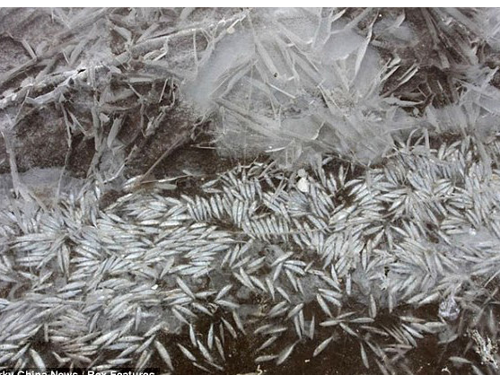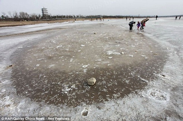 Theo các nhân viên văn phòng bảo vệ môi trường địa phương, khúc sông này được rút nước để xây dựng đường tàu điện ngầm gần đó. Vì nhiệt độ thấp và nước cạn, cá trong sông đóng băng hết. Vì cá nổi gần mặt băng nên chỉ cần một cái xà beng nhỏ là có thể lấy được cá dễ dàng.