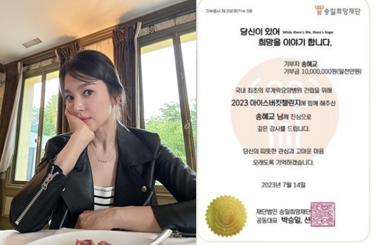 Song Hye Kyo đã tiết lộ giấy chứng nhận quyên góp 10 triệu won (khoảng 186 triệu đồng) đứng tên cô cho Quỹ Hy vọng Seungil. Trên giấy chứng nhận quyên góp, có ghi dòng chữ: "Chúng tôi chân thành cảm ơn sâu sắc Song Hye Kyo vì đã tham gia Thử thách xô nước đá vào năm 2023 để thành lập Bệnh viện điều dưỡng Lou Gehrig đầu tiên ở Hàn Quốc".