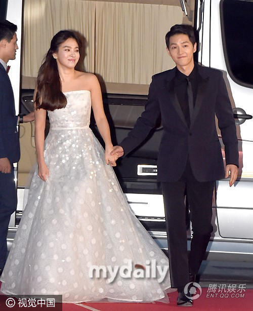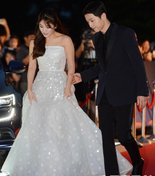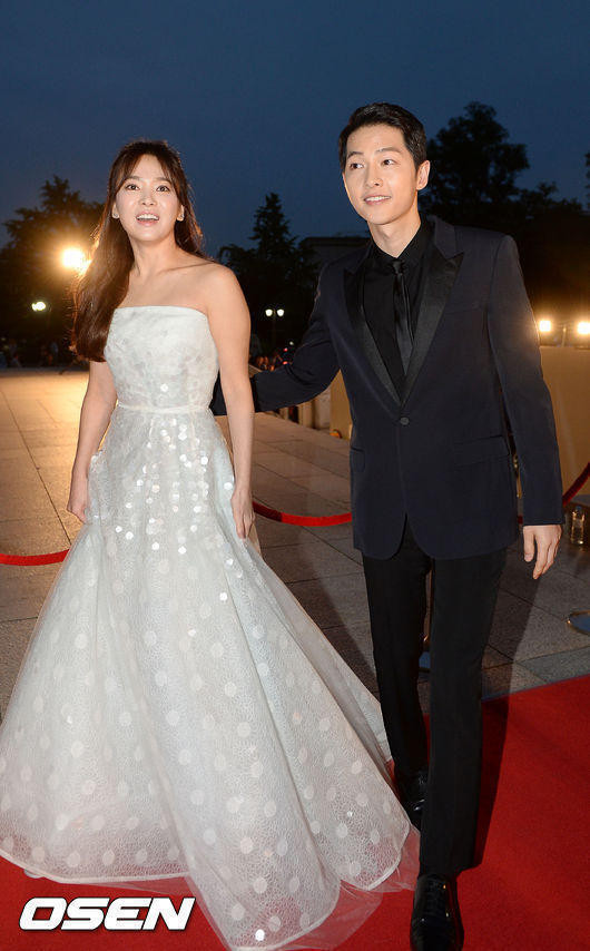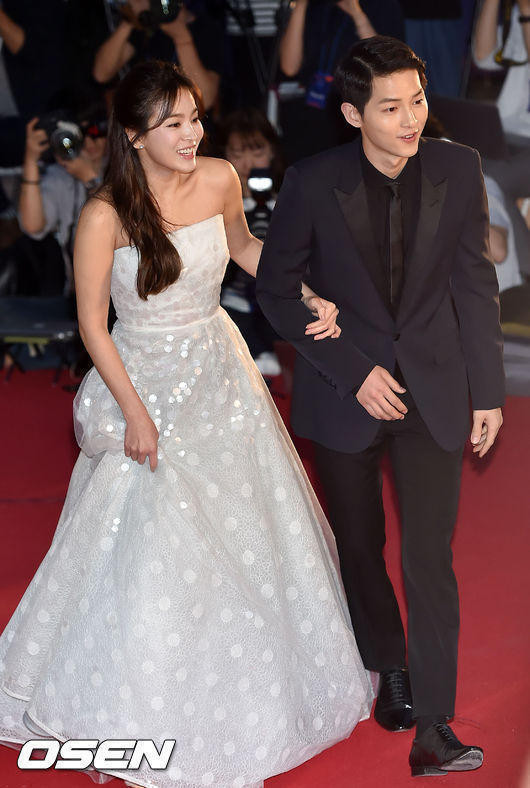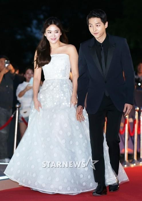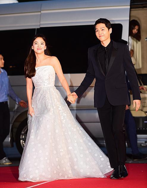 Song Hye Kyo xinh đẹp rạng rỡ khoác tay “chàng đại úy Yoo” Song Joong Ki bảnh bao trong bộ vest đen.