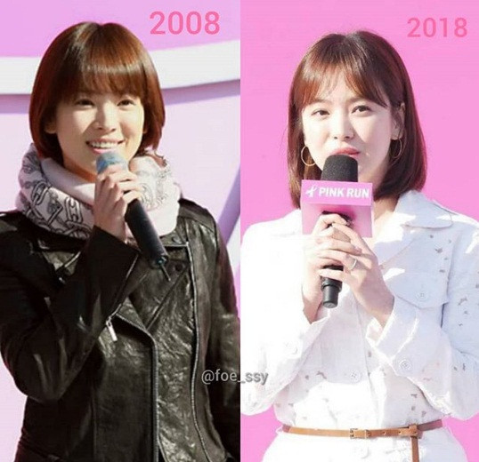 Có fan đã ghép ảnh Song Hye Kyo năm 2008 và trong sự kiện lần này để thấy rằng trông cô gần như không thay đổi gì sau 10 năm.
