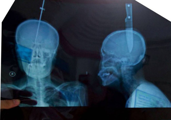 Phim chụp X-quang chiếc dao cắm trên đầu bà Liu. Ảnh: Rex