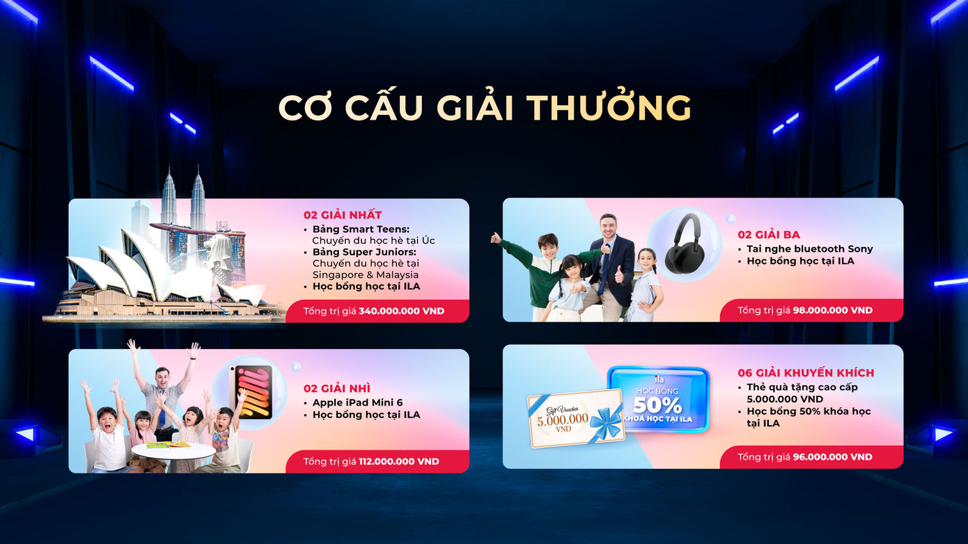 ● Bảng Smart Teens: 1 GIẢI NHẤT trị giá 190 triệu (Chuyến du học hè tại Úc & học bổng học tại ILA); 1 GIẢI NHÌ trị giá 58 triệu (Apple iPad Mini 6 & học bổng học tại ILA); 1 GIẢI BA trị giá 47 triệu (Tai nghe bluetooth Sony & học bổng học tại ILA); 3 GIẢI KHUYẾN KHÍCH trị giá 16 triệu (Thẻ quà tặng cao cấp 5 triệu & học bổng 50% khóa học tại ILA).