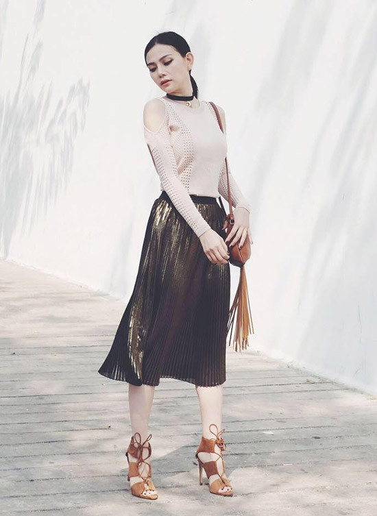 Kiểu váy xếp ly mốt năm nay tưởng như chỉ dành cho các nàng điệu nhưng lại được Sĩ Thanh chinh phục theo cách rất xì po.