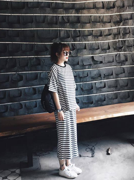 Diện cả cây đồ cùng họa tiết kẻ sọc từng bị xem là tối kỵ, nhưng điều đó dường như chẳng hề gì với nàng fashionista Yến Nhi.