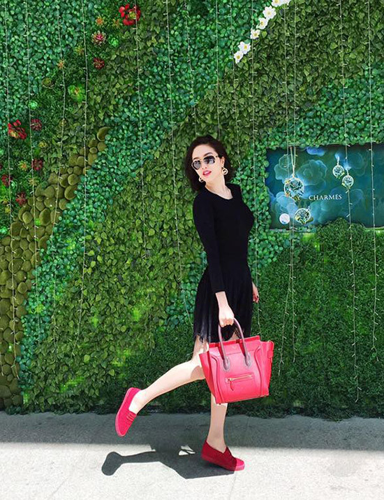 Bảo Thy diện váy đen, điểm nhấn là phụ kiện đỏ tung tăng dưới nắng.