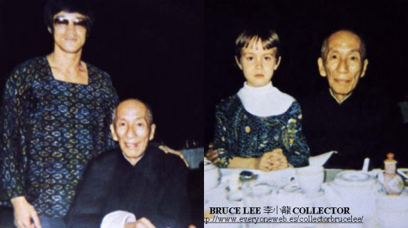Diệp Vấn trong ngày hội ngộ học trò Lý Tiểu Long khi anh đã là ngôi sao tầm quốc tế (ảnh trái). Tại buổi tiệc, ông còn chụp ảnh với con trai Lý Quốc Hào. Ba thế hệ trong tấm ảnh năm xưa, giờ không một ai còn sống. Con trai Lý Tiểu Long qua đời trên phim trường khi mới ngoài 20 tuổi.