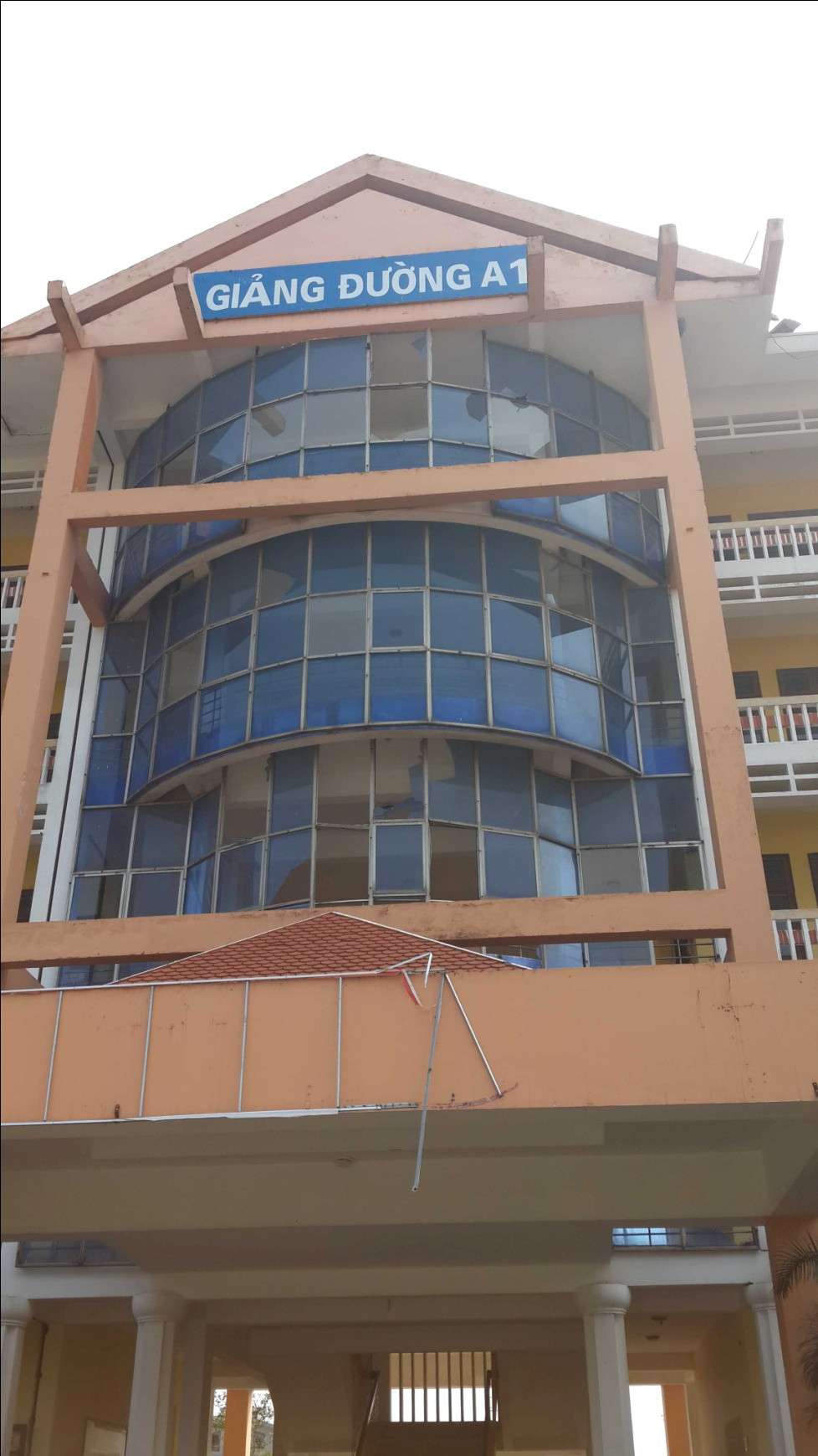 | Vách kính của Đại học Đồng Hới bị tàn phá nặng nề sau cơn bão. |