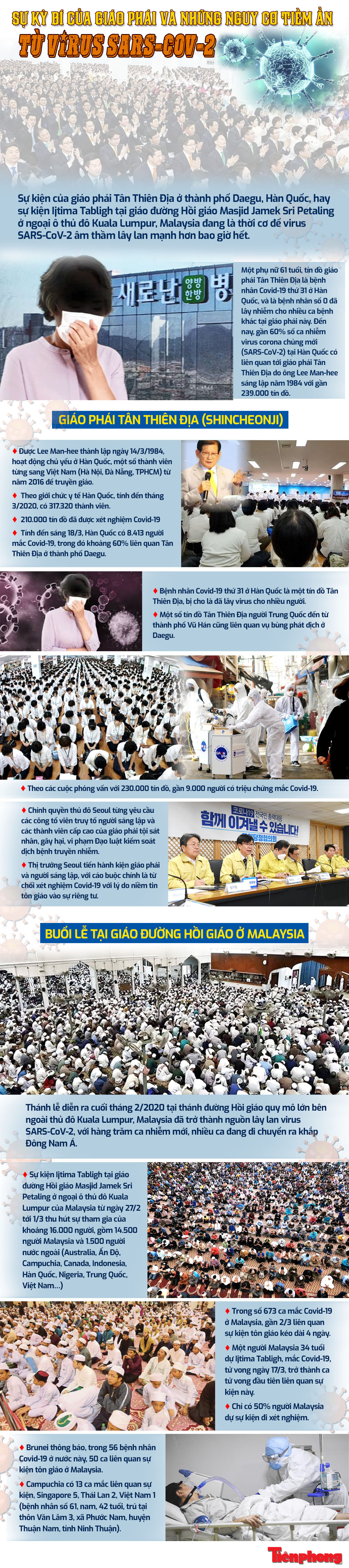 TPO - Sự kiện tôn giáo của giáo phái Tân Thiên Địa ở thành phố Daegu, Hàn Quốc, hay sự kiện Ijtima Tabligh tại giáo đường Hồi giáo Masjid Jamek Sri Petaling ở ngoại ô thủ đô Kuala Lumpur, Malaysia đang là thời cơ để virus SARS-CoV-2 âm thầm lây lan nguy hiểm hơn bao giờ hết.