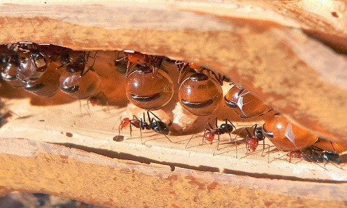 Kiến mật tiêu thụ thức ăn do kiến thợ đem đến và lưu trữ các chất dinh dưỡng ở dạng nước, chất lỏng và chất béo. Theo thời gian, chất lỏng bên trong khiến bụng chúng căng phồng lên, đạt kích thước bằng một quả nho.