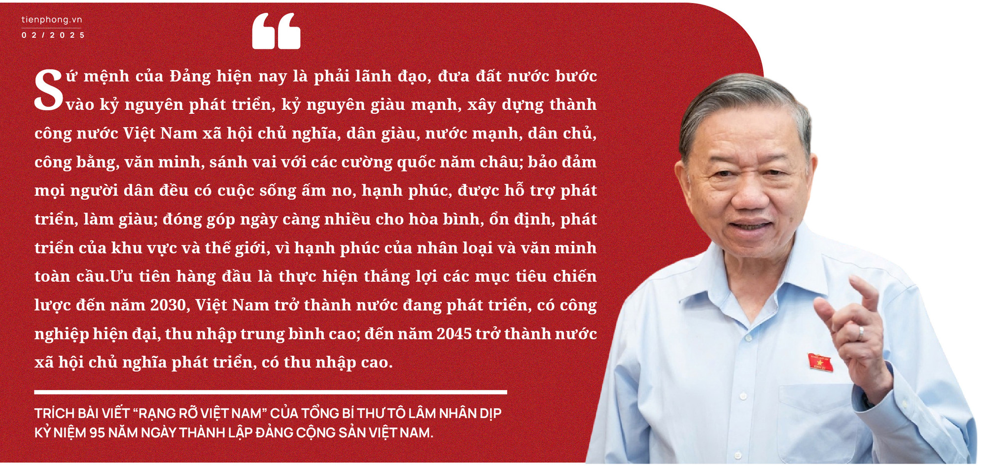 Phát biểu tại cuộc gặp các cán bộ nguyên là lãnh đạo Đảng, Nhà nước nhân dịp Tết Nguyên đán Ất Tỵ 2025, Tổng Bí thư Tô Lâm nhấn mạnh, nhìn lại lịch sử, truyền thống vẻ vang và đầy tự hào của Đảng trong 95 năm qua, chúng ta càng thấy rõ hơn trách nhiệm của thế hệ lãnh đạo và đảng viên hôm nay trong tiến trình lịch sử của dân tộc. Sứ mệnh của Đảng hiện nay là phải lãnh đạo, đưa đất nước bước vào kỷ nguyên phát triển, giàu mạnh, xây dựng thành công nước Việt Nam xã hội chủ nghĩa, dân giàu, nước mạnh, dân chủ, công bằng, văn minh, sánh vai với các cường quốc năm châu; bảo đảm mọi người dân đều có cuộc sống ấm no, hạnh phúc, được hỗ trợ phát triển, làm giàu; đóng góp ngày càng nhiều cho hòa bình, ổn định, phát triển của thế giới, hạnh phúc của nhân loại và văn minh toàn cầu.
